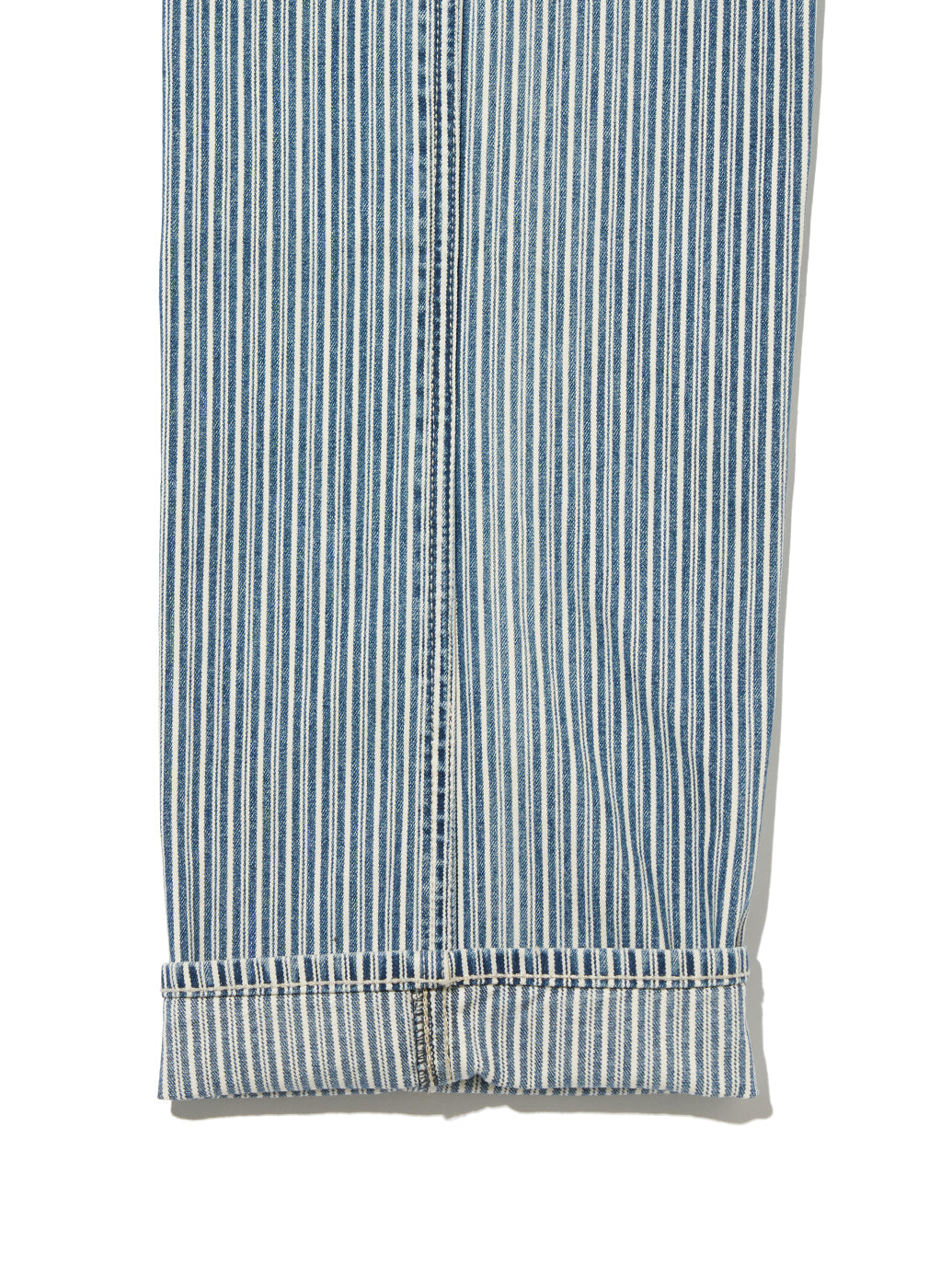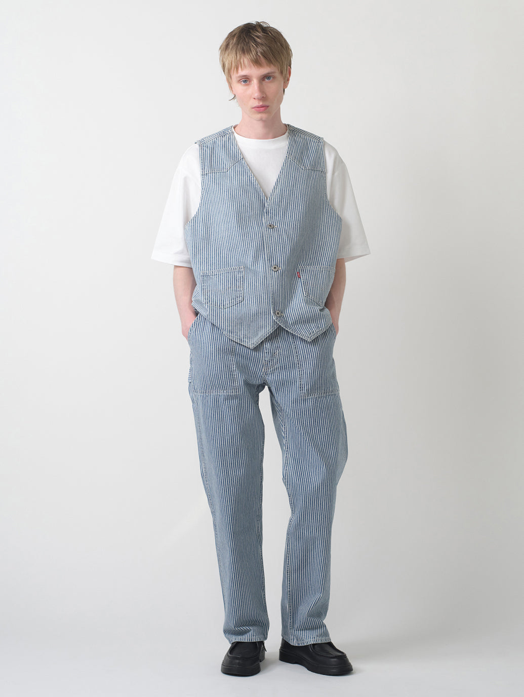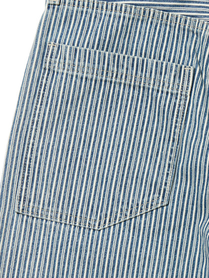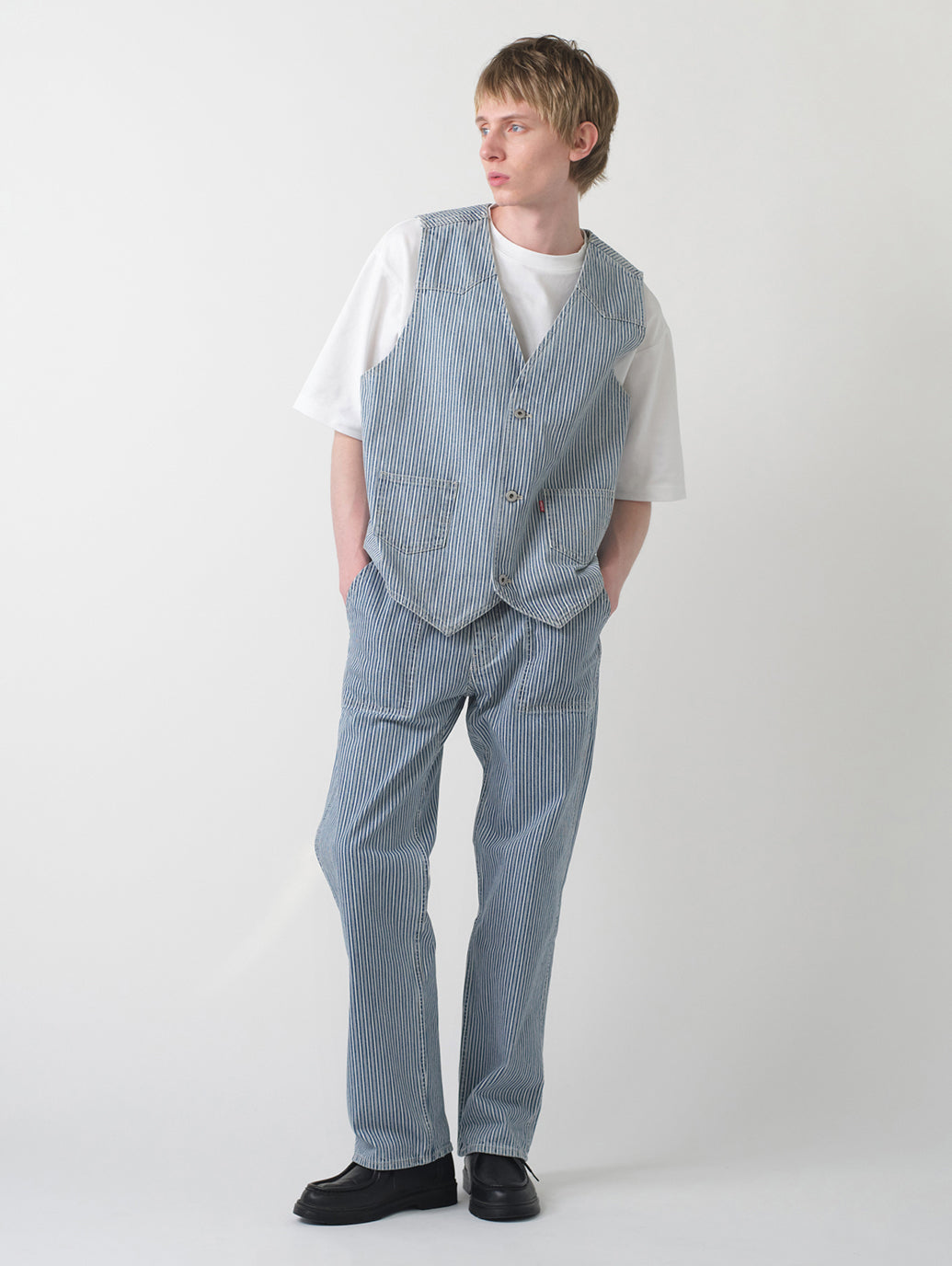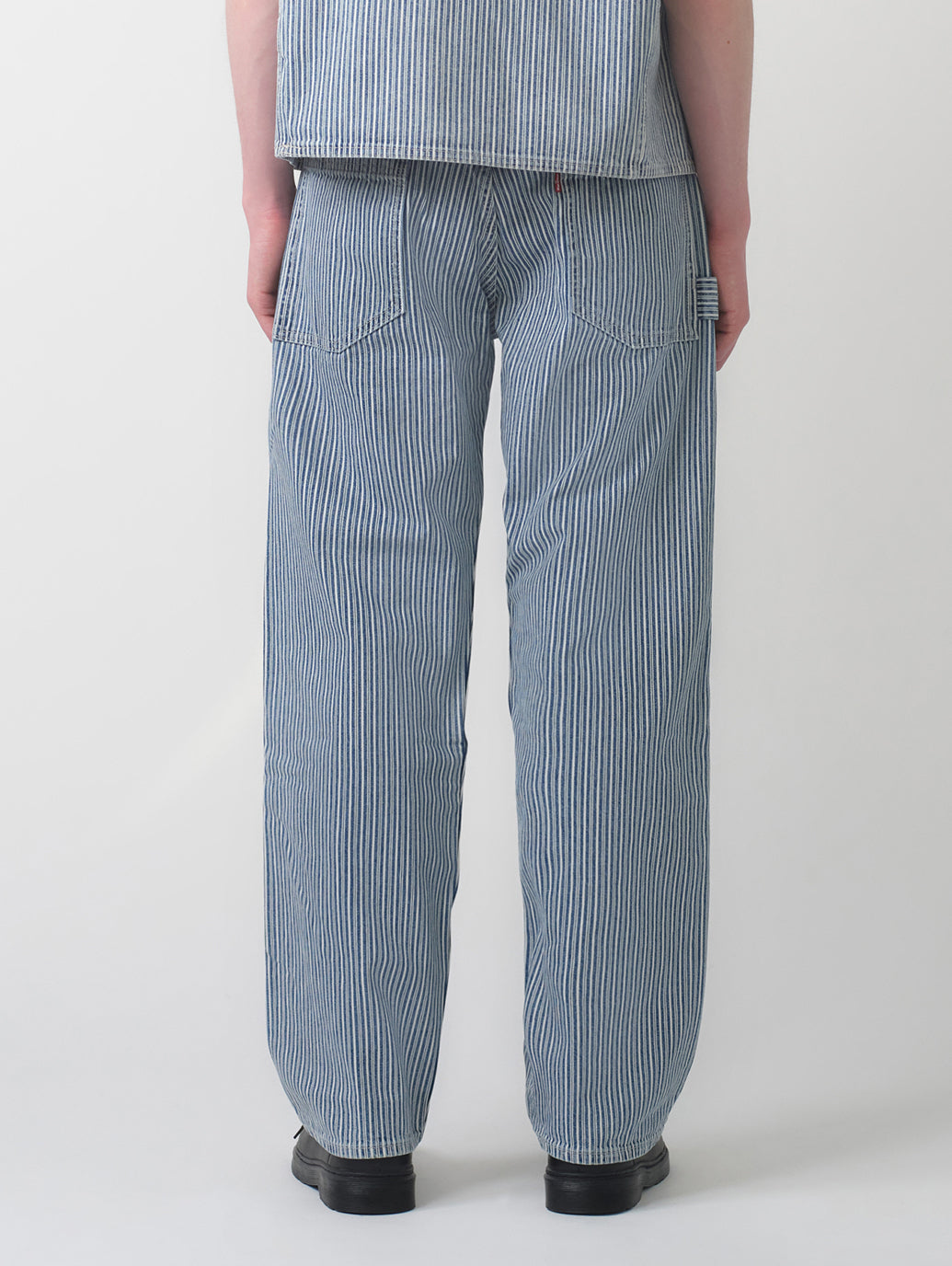 リラックス感のあるゆったりとしたストレートフィットのユーティリティパンツ。ワークテイストの雰囲気満載のヒッコリーストライプ柄、サイドにハンマーループも配し、ワーク要素も取り入れているのが特徴です。ポケットのアーキュエイトステッチも取り除きシンプルなデザインになっています。普段穿くのは勿論、作業着としても活躍する一本です。