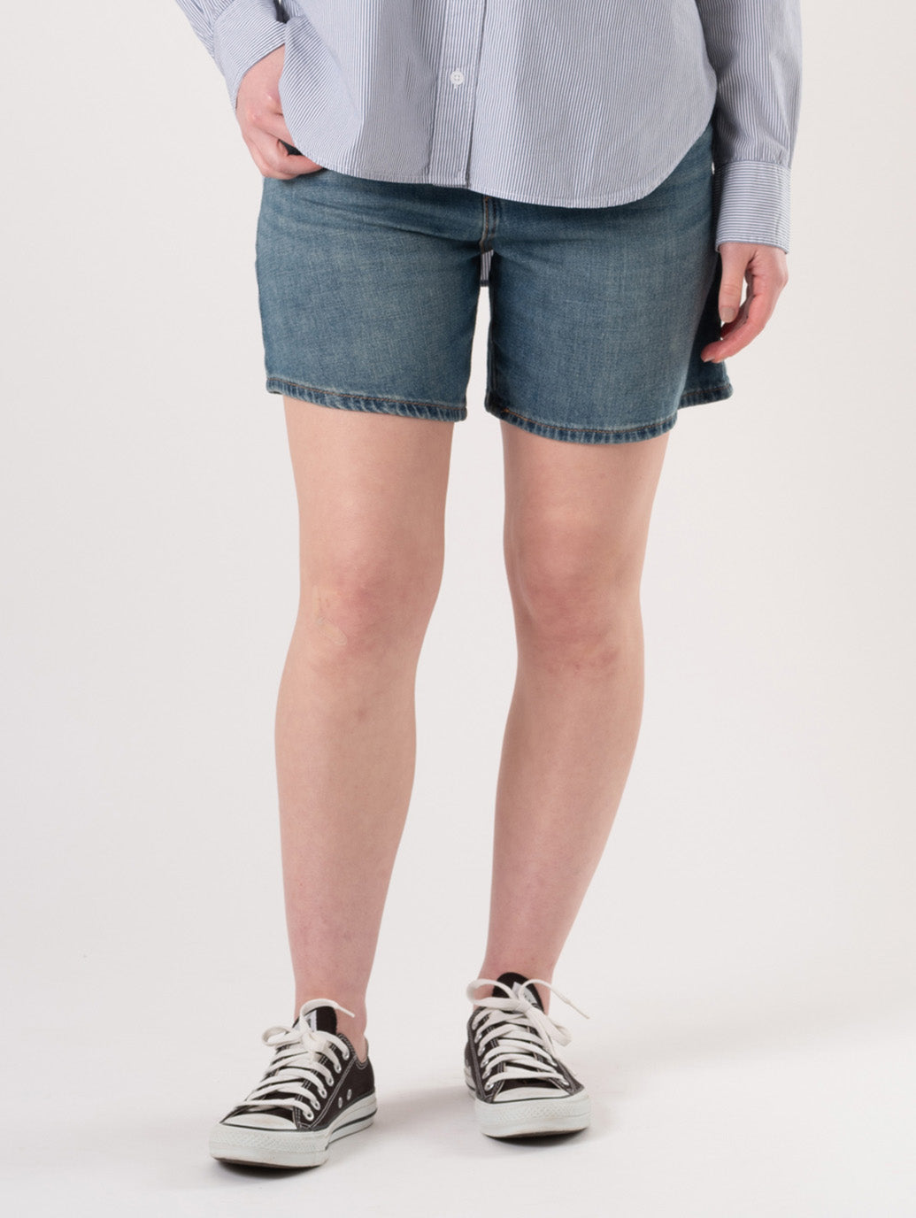 ハイウェスト、動きやすいゆったりとした太もも周りです。インディゴカラーで太もも周りがスッキリ見えるマストハブのショートパンツです。