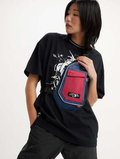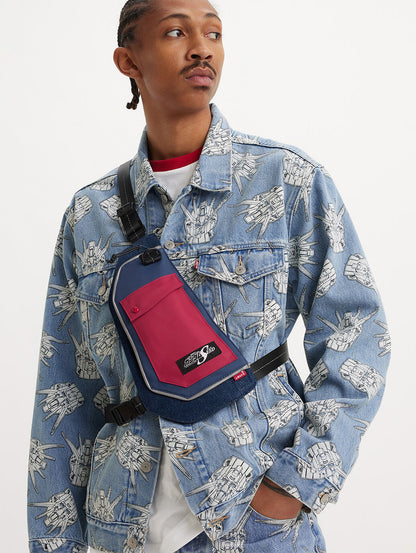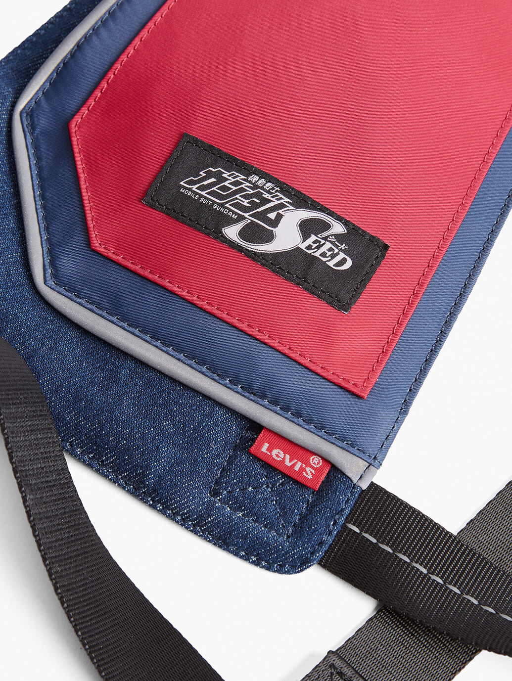 Levi's®らしいデニム地をベースにしたハーネスバックには、調整可能なストラップが付属し、外側には小さめなレッドカラーのポケットを配したデザインです。機動戦士ガンダムSEEDのタグとLevi’s®のレッドタブもポイントです。アウターとトップスの上から装着して小物入れとして活躍するアイテムです。