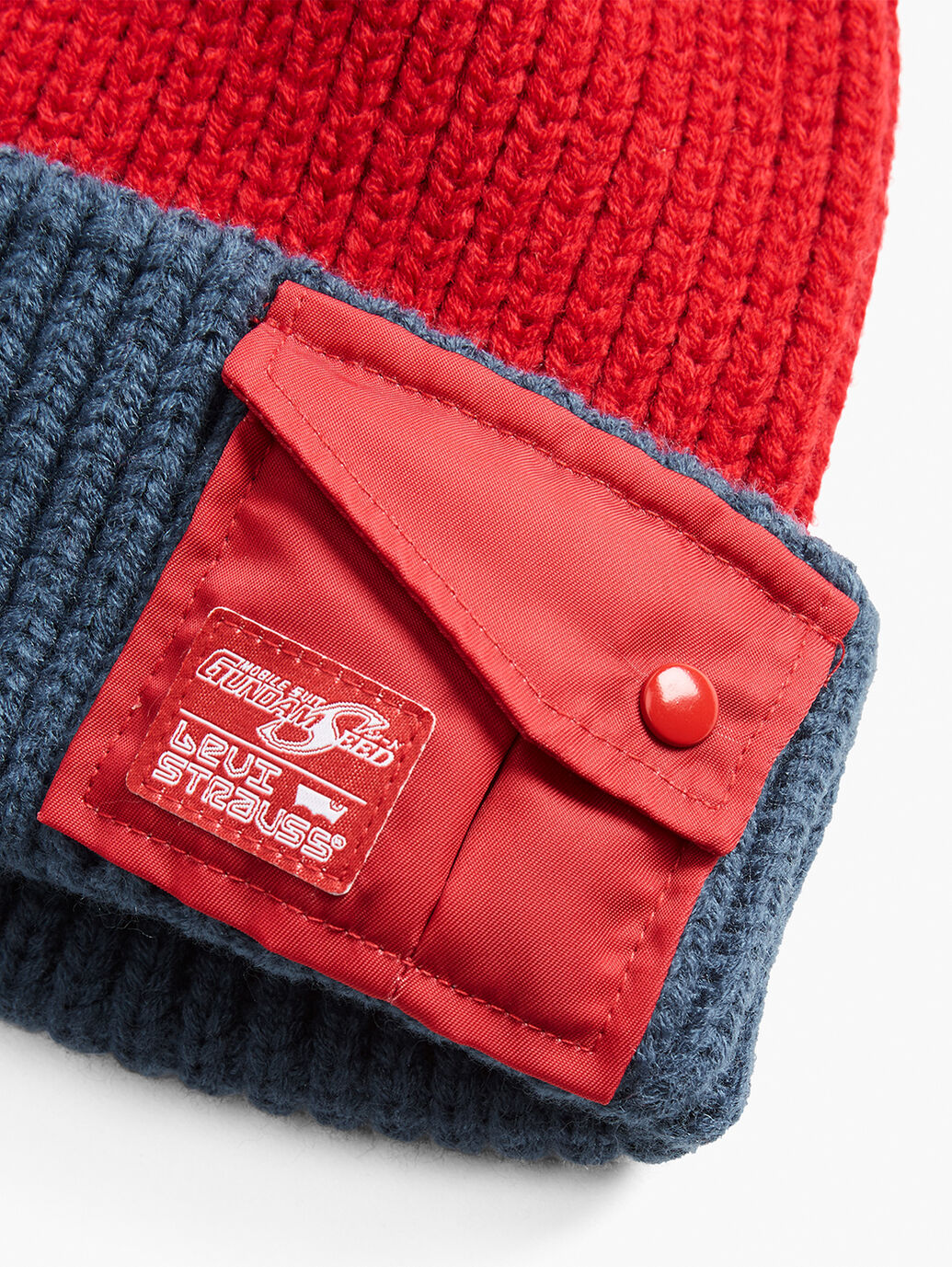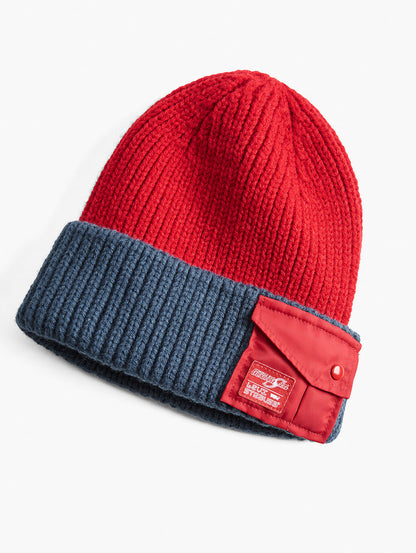 レッドとネイビーのツートーンカラーのビーニーにコラボレーションんも証であるパッチを配したナイロン製のポケットが付属するデザインです。ポケットとロゴも赤色で統一されているので普段のスタイリングに取り入れやすく、ファッションとしても防寒アイテムとしても活躍します。