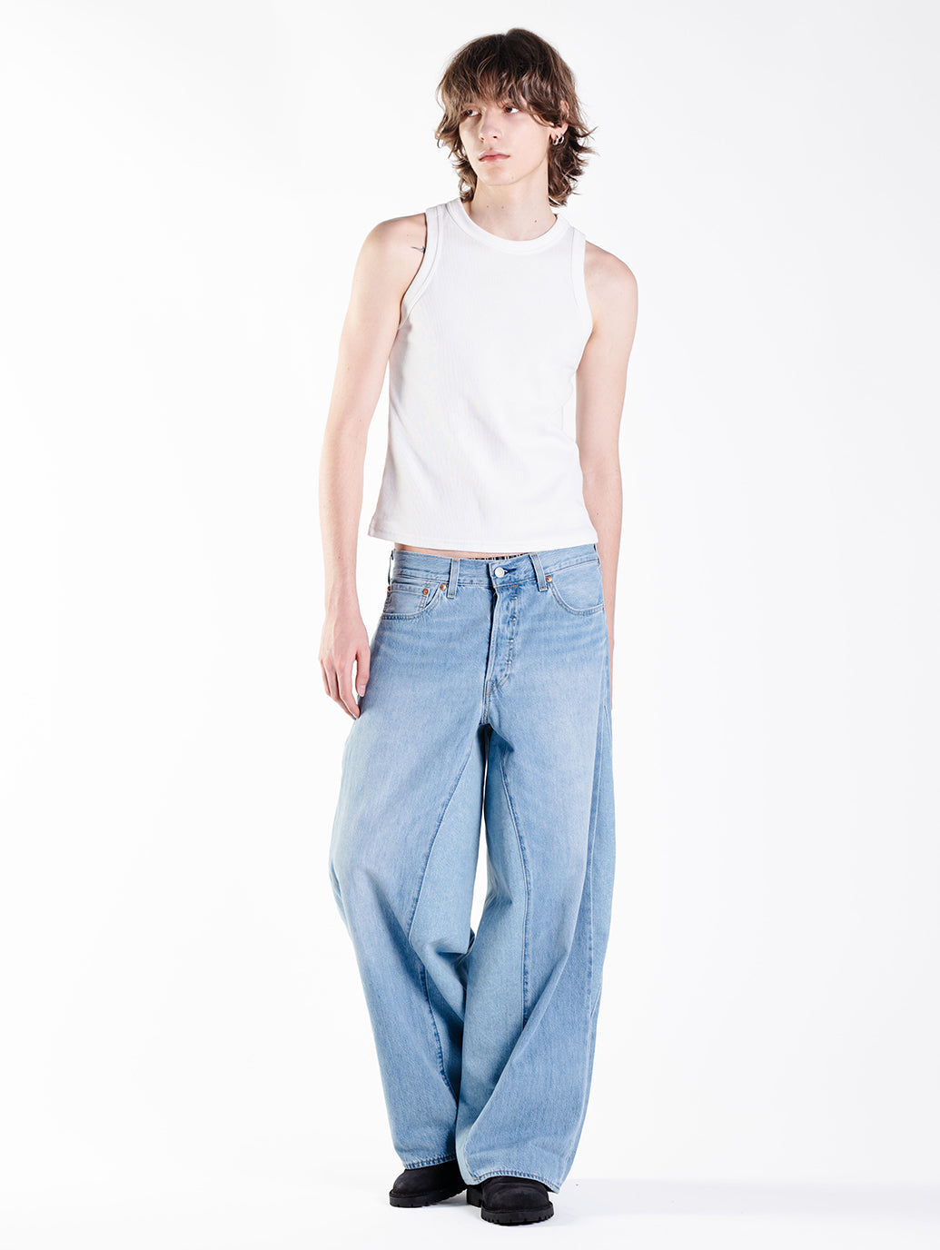 前モデルのV1、V2と同様、501®をベースにカスタマイズされ、インシームとアウトシームに異なる生地を挿入し、独自のデザインを加えています。特に今回のV3では、最大25cm幅の生地をインシームに挿入し、よりバギーシルエットへと進化。太めのシルエットが特徴で、トレンド感溢れるスタイルを提供します。アウトシームには、V2モデルで好評だったボリューム感を強調するデザインを再採用。これにより、スーパーバギーワイドシルエットが実現しました。※「(R)」のみが表記されたレッドタブは、LEVI'S(R)の文字が含まれるレッドタブと同様に製品不具合ではありません。